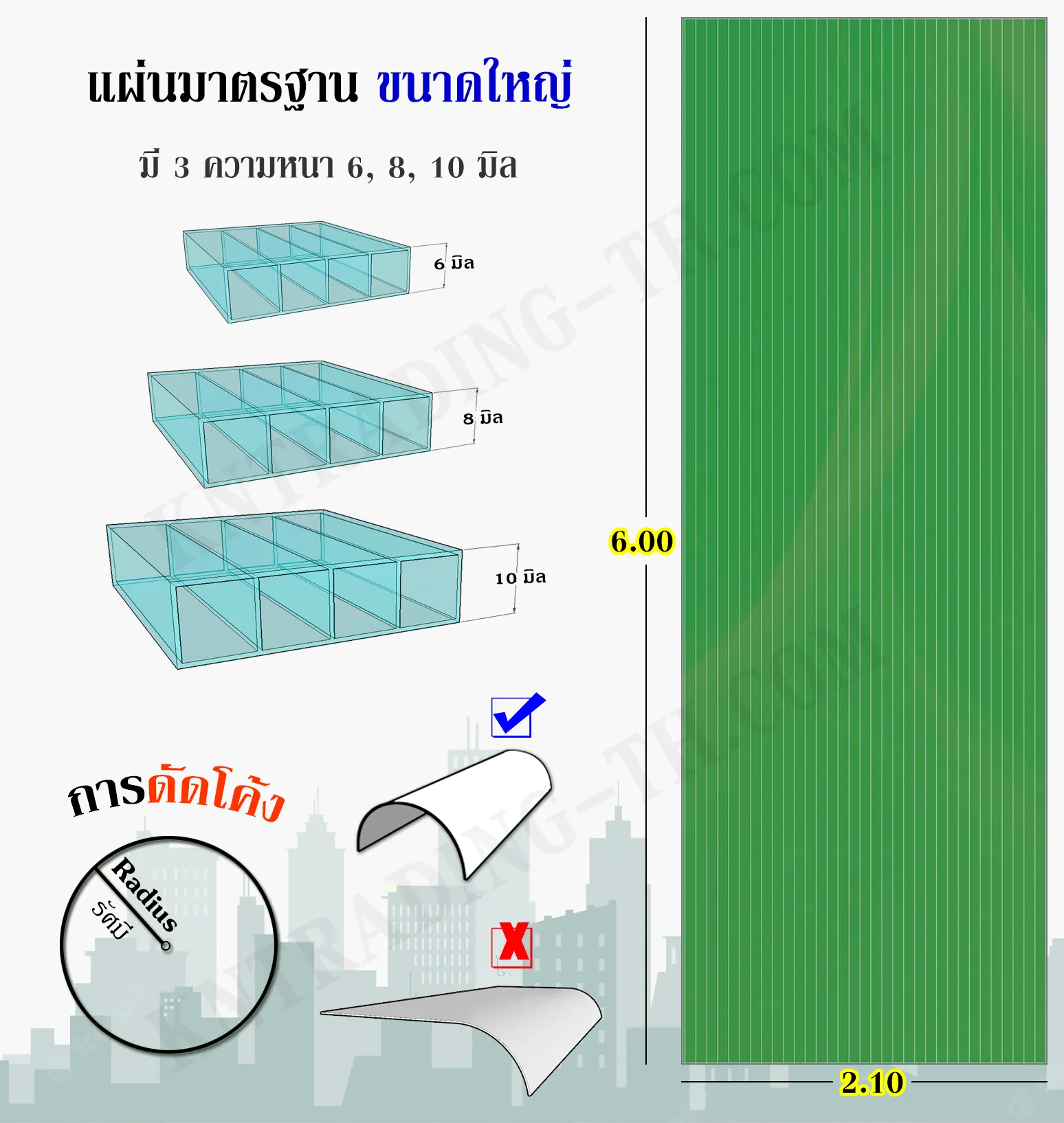2.10m.x6.00m. | 6 มิล | ใส, ขาว, เหลือง, น้ำเงิน, ฟ้าใส, ฟ้าน้ำทะเล, ชา, เทา, เขียว, ชมพู, แดง, ส้ม, ซิลเวอร์, บลูซิลเวอร์, โกลด์ มินเลเนียม, ใสมุก, น้ำเงินมุก, เขียวมุก, ส้มมุก, เทามุก, ชามุก, เหลืองมุก, ฟ้าน้ำทะเลมุก | 16.3-16.4kg |